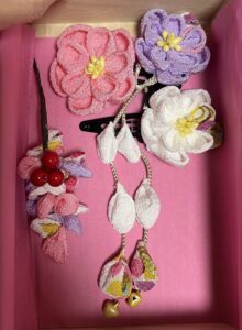 菊の香りがする空間が心地よく晴れやかな気分になります。昨日は、着付教室の催しに姪と一緒に参加しました。小さな姪へと、急遽思い立ち、髪飾りを作りました。